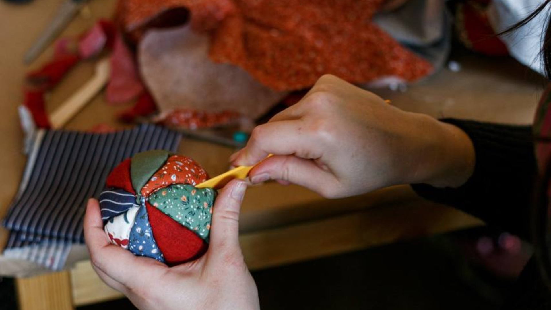 С помощью японского искусства мы украсим простой шарик мозаикой из разноцветной ткани.